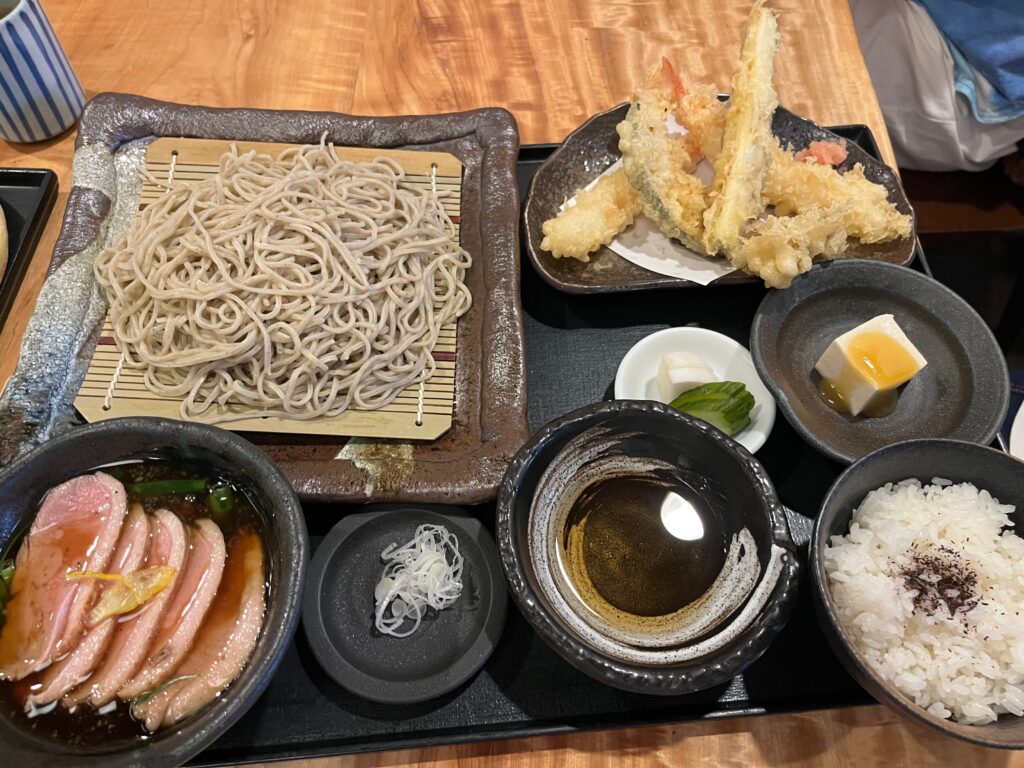 鴨せいろ御膳(2600円)↓は海老天2本、野菜天が3種類にご飯、冷や奴も付いたよくばりメニュー。しっかり食べたい人にも満足の食べ応えで、鴨もつけ汁ももちろんお蕎麦も美味しいと好評でした。