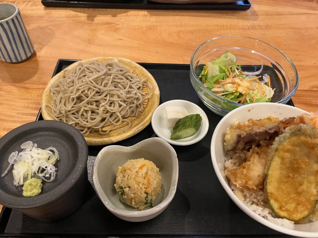 私は平日ランチメニューから、ミニ天丼とおそばの定食↓(税込み1600円)にしました。サラダと小鉢(甘く炊いたおから)ぬか漬けとデザート付き。天丼の全容を捉えられていませんが、天ぷらはズッキーニと煮たサツマイモ、海老天と、天丼には珍しいちくわ天の四種類でした。そばつゆ丼つゆは甘みを抑えたキリッとした味付けで、温冷選べるお蕎麦も香り高く美味しい。店内の待合席にいた時、運ばれて行くこのお料理が目に入って、お茶碗も大きくないしお蕎麦も上品な盛りで、満腹手前くらいの量かな?と見当を付けたのですが、腹十一分目くらいのボリュームでした。