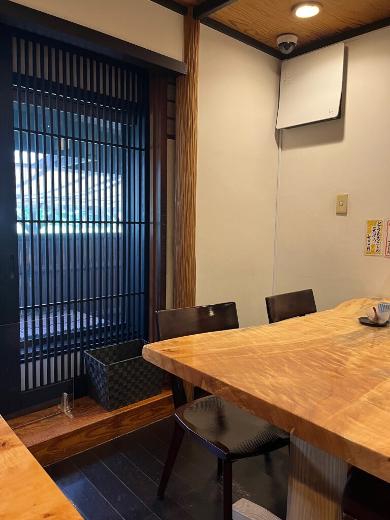 隣席の方が退出したさいに撮影した店内の様子↓。格子戸の外は屋外の待合スペース(いちおう日陰で大きな扇風機も設置されている)で、この日の35度近い気温もなんのその、行列している方が大勢いました。お料理の到着が早い(私たちは注文後10分くらいで全員ぶん配膳された)のと、店員さんたちがテキパキしてフォーメーションにも無駄がない感じで、激混みのわりに回転は早い印象でした。