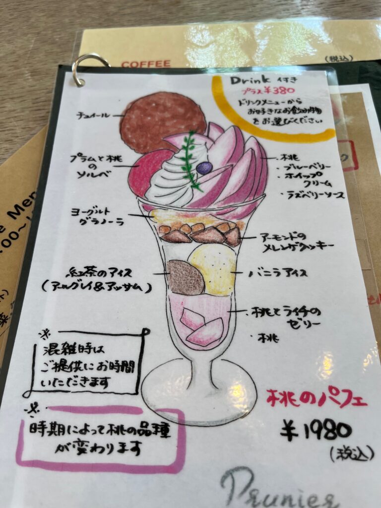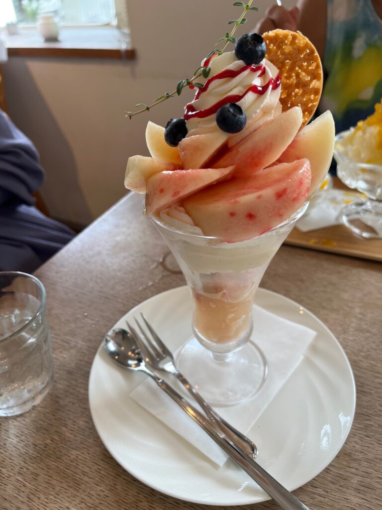 桃のパフェ(1980円)にした人も。けっこうなボリュームでしたが、甘いものとお喋りは親和性高く(^_^)すごく美味しかったと完食されていました。