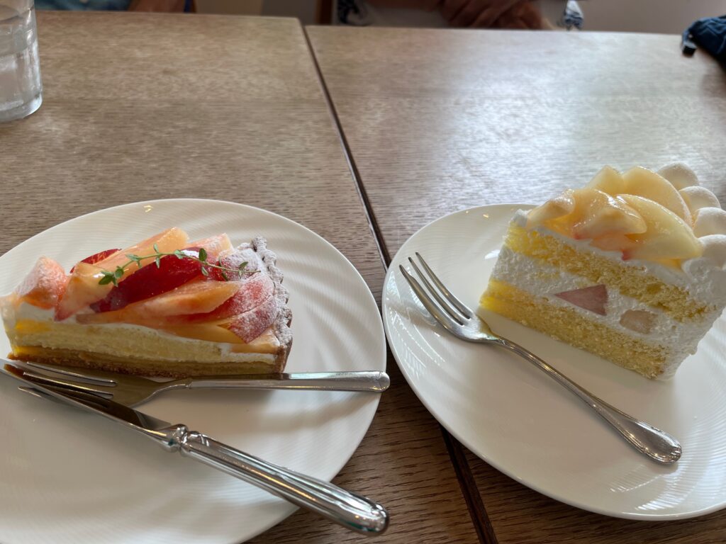 かき氷もパフェもいいけれど、プルニエさんに来てショーケースが目に入るとやっぱりケーキが食べたくなった私ともう1人。今は桃よ桃!と言うことで、桃と貴陽のタルト(左620円)と、桃のショートケーキ(620円)をシェアしました。赤くツヤツヤ見えているのが「貴陽」でスモモだそうです。桃は好きだけど酸っぱいスモモは嫌いな私ですが、ざくざくのタルト生地や甘いクリームと合わさると抜群のハーモニーに。桃のショートケーキは、想像通りの全てが優しい上品な味わい。やっぱりプルニエさんのケーキは美味しいです。ホットコーヒー(540円)もお願いして私のお会計は1160円なり。ごちそうさまでした。