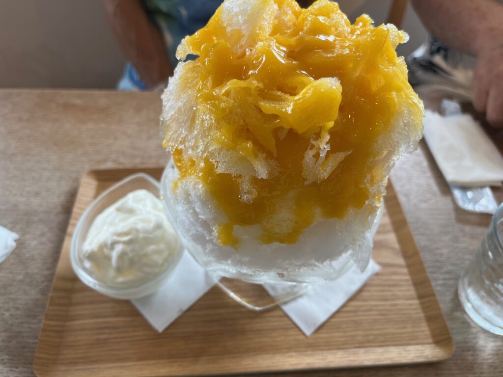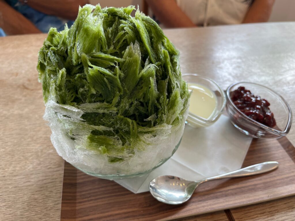 茅ヶ崎まで戻っておやつの時間、近頃はかき氷も評判の高田のプルニエさんへ。かき氷ブームが到来してずいぶん経ちますが、夏が年々長く酷くなっているせいか、扱いのなかったお店もどんどん参戦している印象です。左が宇治抹茶あずき(960円)、右はトロピカルフルーツ(宮崎マンゴー、ゴールデンパイン、パッションフルーツ入り980円)。いわゆるアイスクリーム頭痛になりがちな人も注文しましたが、最後までセーフだったとのこと。