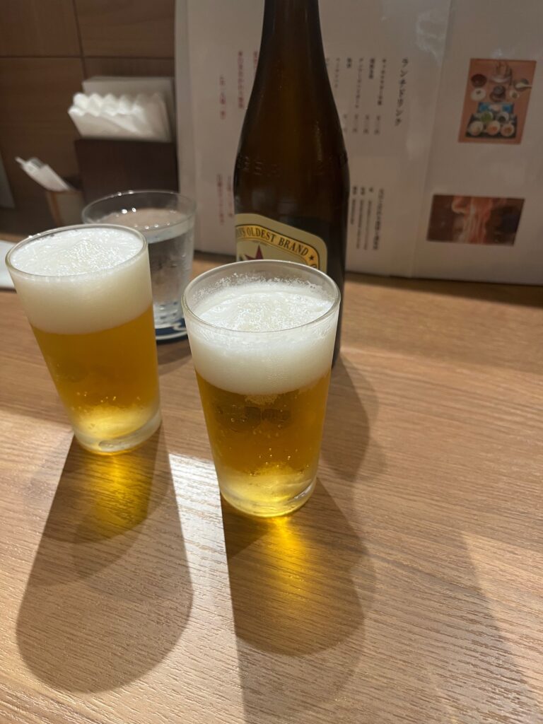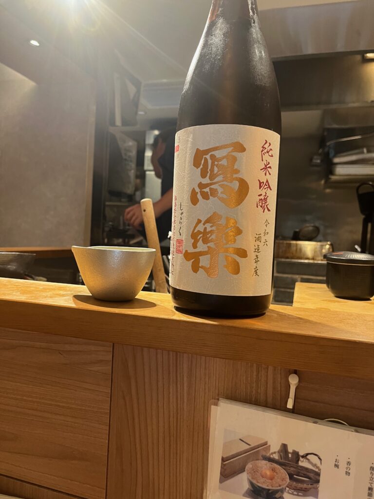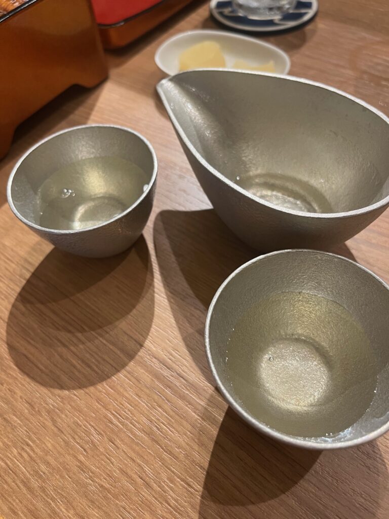 日本酒は10種類ほどの品揃えがあり一律800円のシステム。写楽は日本酒らしいほんのり甘みを感じるお酒でした。量はしんによると半合より多く一合には満たない感じだそうで、知らない味にチャレンジしやすい仕組みですね。重みのある錫の酒器も素敵でした。