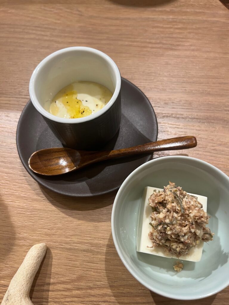 照明暗めの落ち着いた店内は4人掛けのテーブル席ふたつ、カウンター席は10席くらいかな?料理人の男性店主とサービス担当の女性の二人で切り盛りされていました。まずは瓶ビール(サッポロ赤星中瓶、税込み500円)で乾杯。予約していたのでお料理もすぐに出てきます。和風タルタルソース(ツナと昆布のマヨネーズ和え。だと思う)の冷や奴と、お店の人気料理だというトリュフとマスカルポーネの茶碗蒸し。どちらもすごく美味しい。茶碗蒸しが、激しくワインを欲する味ですが、ワインは昼も夜もボトル販売しかないそうでふたりでワンボトルという手もあったけど、しんは鰻で日本酒を楽しむ気満々のるんるんなので諦めました(>_<)。