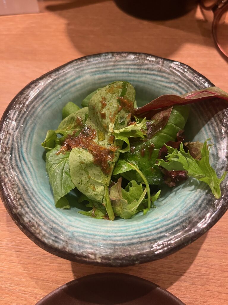 藤沢の地場野菜のサラダは醤油味のドレッシングがかかっていました。青のりのすまし汁、お漬物とともに・・