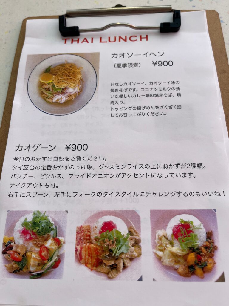テーブル席が8人ぶん、カウンターに4席の小さな店内。営業は8時半からでモーニングセットあり。食事メニューは数種類のスパゲティとトーストやサンドイッチのパン系、ケーキやコーヒーゼリーなど甘い物のラインナップ。加えて木曜日はタイ料理のランチがある日だそうで、常連らしい方々はみなさんタイランチを注文されていましたが・・・
