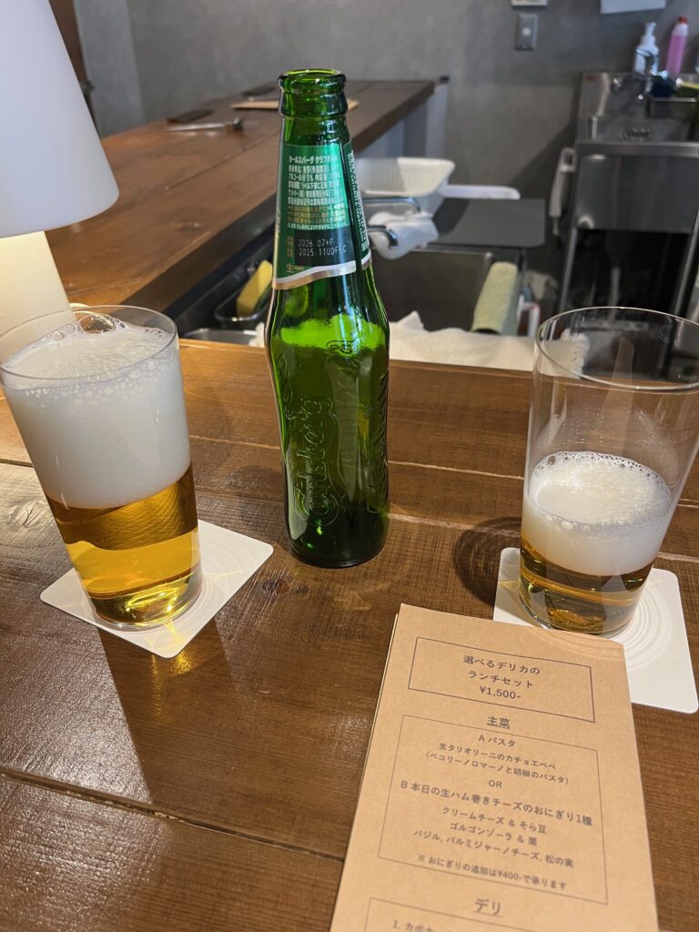 生ハムとチーズのおにぎりぃい???と懐疑的だったしん(食べて即撤回)はパスタの主菜と、デリはソーセージとレンズ豆の煮込みをチョイス。シェアして食べましたが、これまたどちらも美味しい。釜揚げしらすのパスタは「生タリオリーニのカチョエペペ」というメニュー名で、魚醤もちょっと使っているそうでシンプルだけど奥深い味わい。生ハムは塩っぱいものなので、生ハム推しのお店だからお料理は全体に塩っぱめかな?と予想していましたが、どのお料理もお酒はすすむけど塩分はほど良くて、本当に美味しかったです。