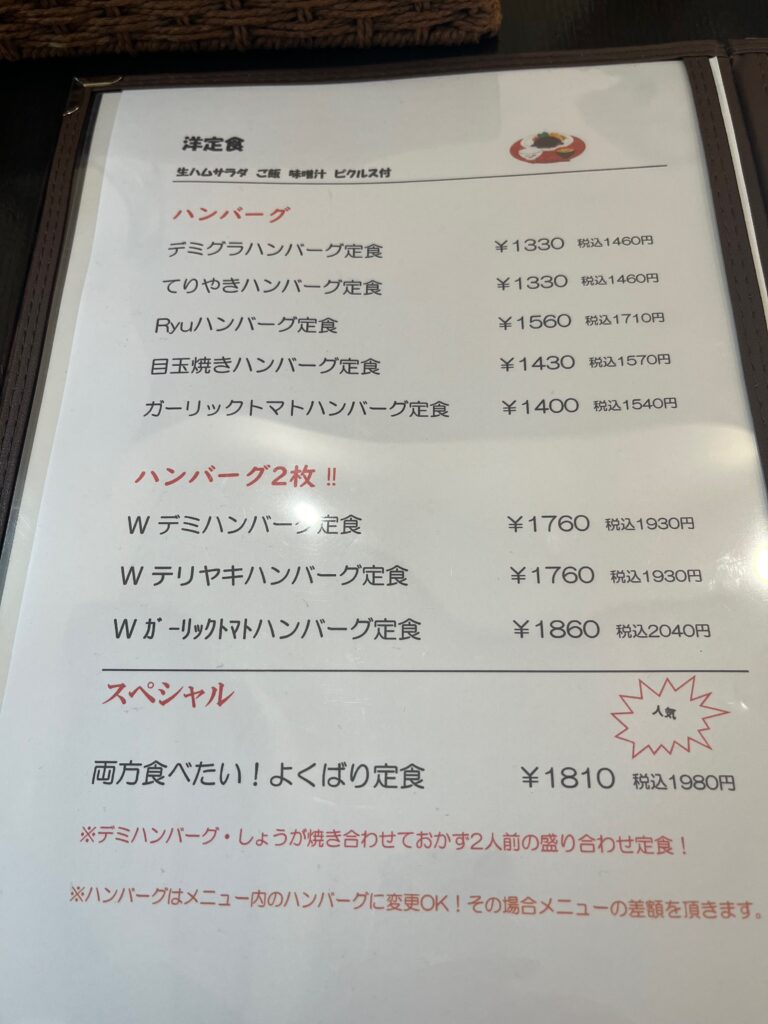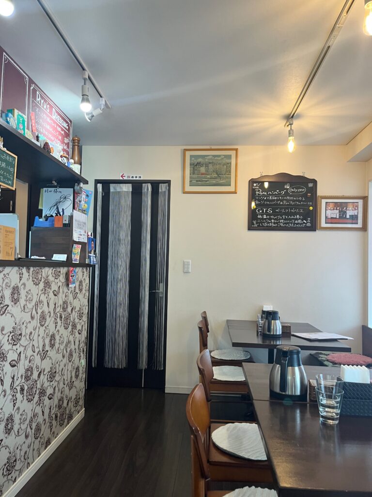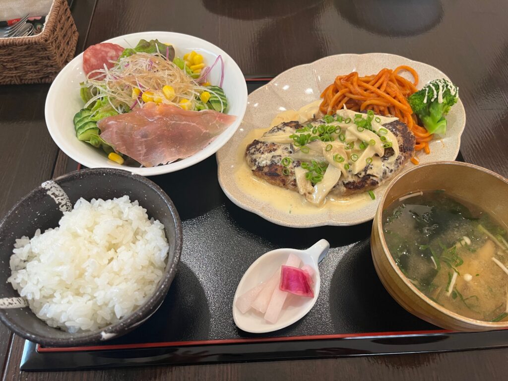初入店なので3人とも店名を冠したRyuハンバーグ定食(税込み1710円)にしました。黒板の説明によると「オンリーワンのRyuハンバーグは、コンソメを煮詰めてキノコと生クリームで作る白いソースのオリジナルメニュー」だそうで、見た目通りの洋風料理ですが、パンより絶対白ご飯に合うハンバーグだと思います。付け合わせのナポリタンも、生ハムを飾ったサラダも美味しいけれど、おしなべて量が多い!次回はご飯を半分にしてもらうことを、張り裂けそうなお腹で確認(^_^;)。電車やバスでは行き難い立地ですが、12時過ぎには残り2卓も埋まって中には若い男性客もおられ、確かに食欲旺盛な人でも満足だろうと思われる、このご時勢に心意気を感じる盛りの良さでした。